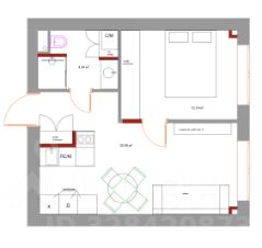 Жилая зона включает уютную гостиную с прекрасно оборудованной кухней и большим окном. В спальне — удобная кровать и вместительный встроенный шкаф. В прихожей предусмотрены встроенные шкафы для хранения вещей.