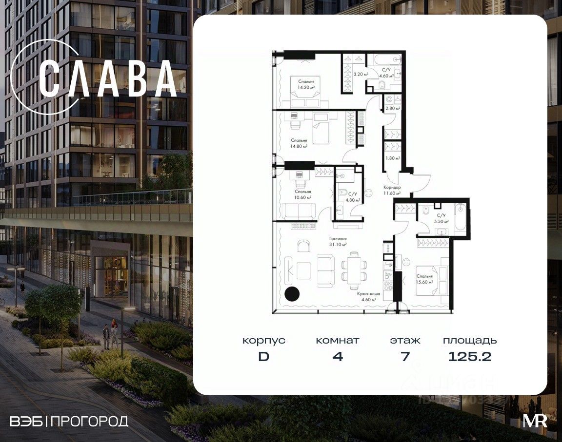 В продаже 4-комнатная квартира площадью 125.20 м² на 7-м этаже корпуса D.