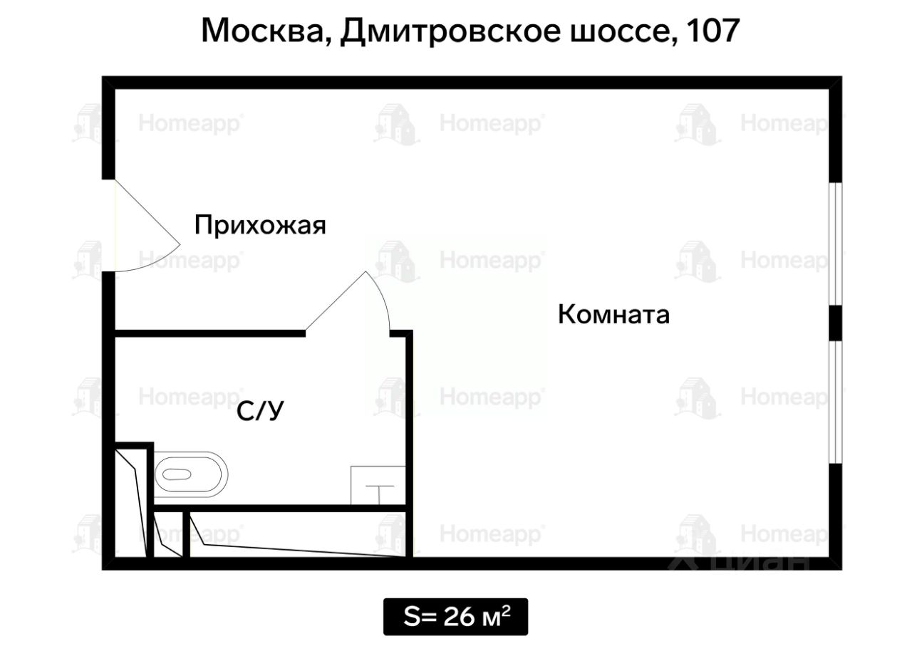 Площадь: 26 м². Правильная форма позволяет удобно зонировать пространство.