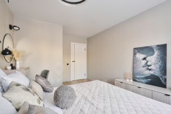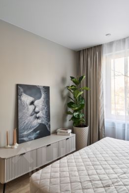 В спальне организована гардеробная, вторая комната свободного назначения (детская, кабинет, гостевая).