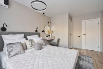 Спальня. Гардеробная. Туалетный стол с зеркалом и подсветкой. Кровать с подъемным механизмом и ортопедическим матрасом.
