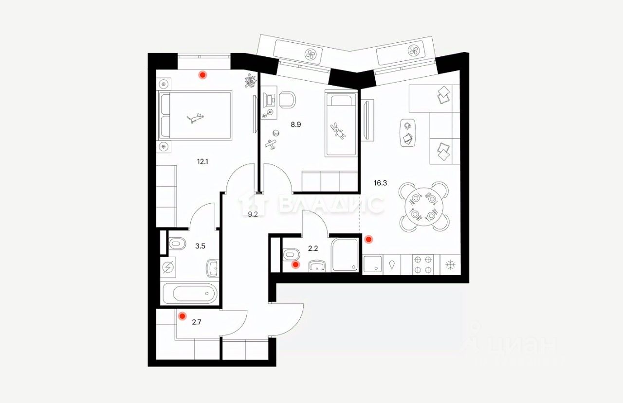 • Две изолированные комнаты: детская 8,9 м² и мастер-спальня 12,1 м²