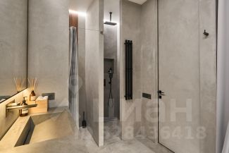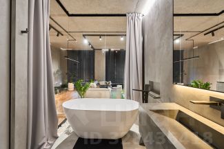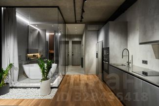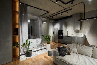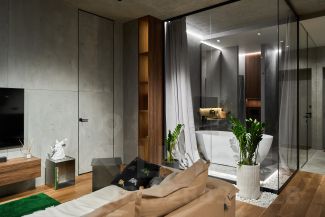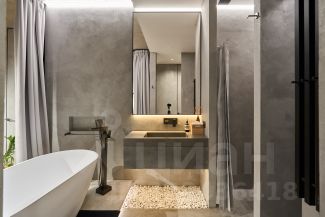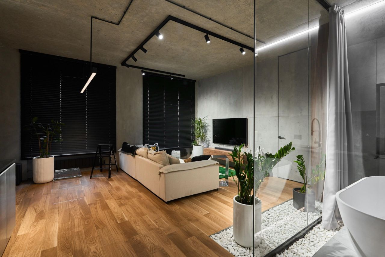 Просторная гостиная (30 м²): Светлое пространство, объединенное с минималистичной кухней. Главный визуальный акцент — дизайнерская ванна на подиуме с декоративной галькой, отделенная стильным стеклянным контуром. Это смелое интерьерное решение создает атмосферу лучших бутик-отелей мира прямо у вас дома.