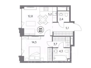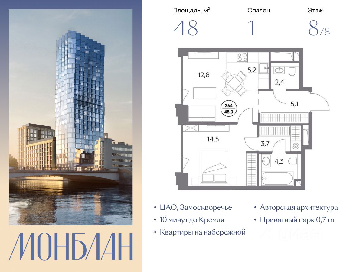 В элитном жилом комплексе "Монблан" на Шлюзовой набережной в Замоскворечье напрямую от девелопера ГК "Галс-Девелопмент" представлена 1-комнатная квартира квартира на 8 этаже общей площадью 48.00 м².