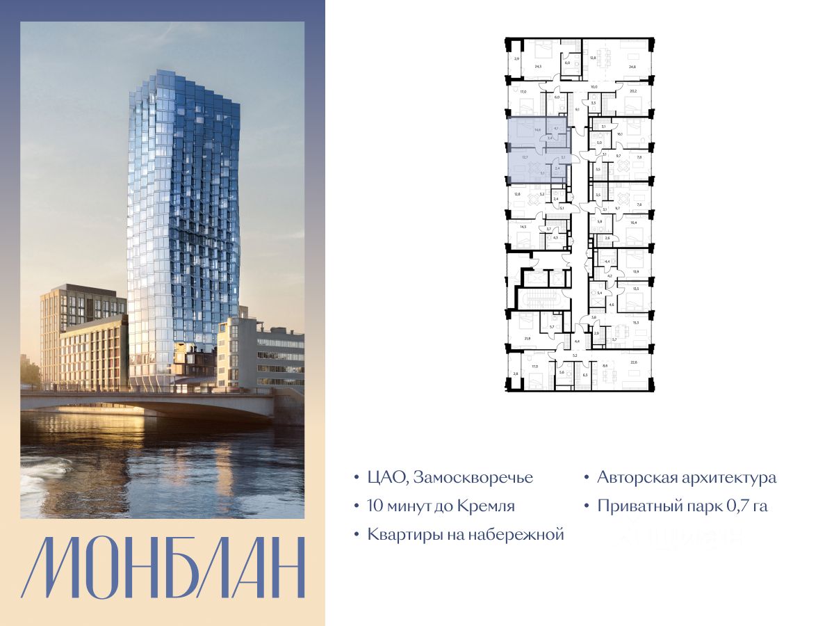 В элитном жилом комплексе "Монблан" на Шлюзовой набережной в Замоскворечье напрямую от девелопера ГК "Галс-Девелопмент" представлена 1-комнатная квартира квартира на 8 этаже общей площадью 47.40 м².