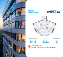 Продаётся 3-комнатная квартира площадью 64.2 м² на 9 этаже в Жилом Комплексе "Родина Переделкино".