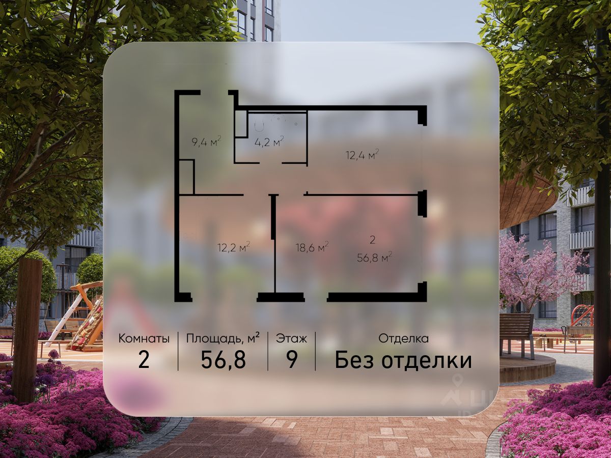 Общая площадь квартиры - 56,8 кв. м, этаж 9 из 17.