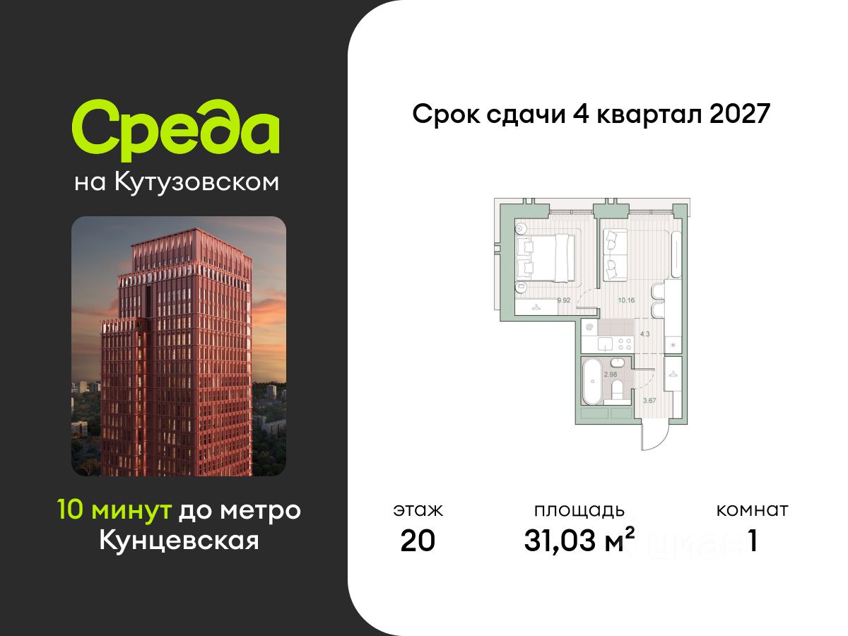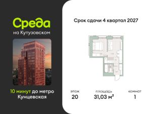 Продаётся однокомнатная квартира общей площадью 31.03 кв. м. с отделкой на выбор: черновая, White Box. Квартира на 20 этаже корпуса 5 в жилом комплексе бизнес-класса "Среда на Кутузовском". До метро "Кунцевская" 10 минут пешком.