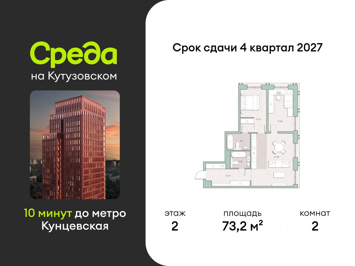 "Среда на Кутузовском" - новый квартал с башнями от 12 до 44 этажей, окружённый лесными массивами и историческими усадьбами старой Москвы. Во внутреннем дворе есть водоём, многоуровневые зоны с детскими и спортивными площадками, коворкинг на свежем воздухе и локации для уединённого отдыха.