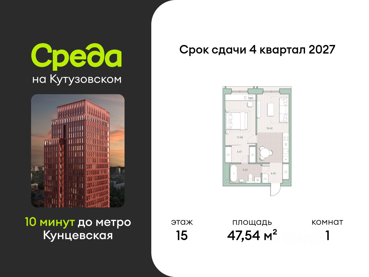Продаётся однокомнатная квартира общей площадью 47.54 кв. м. с отделкой на выбор: черновая, White Box. Квартира на 15 этаже корпуса 5 в жилом комплексе бизнес-класса "Среда на Кутузовском". До метро "Кунцевская" 10 минут пешком.