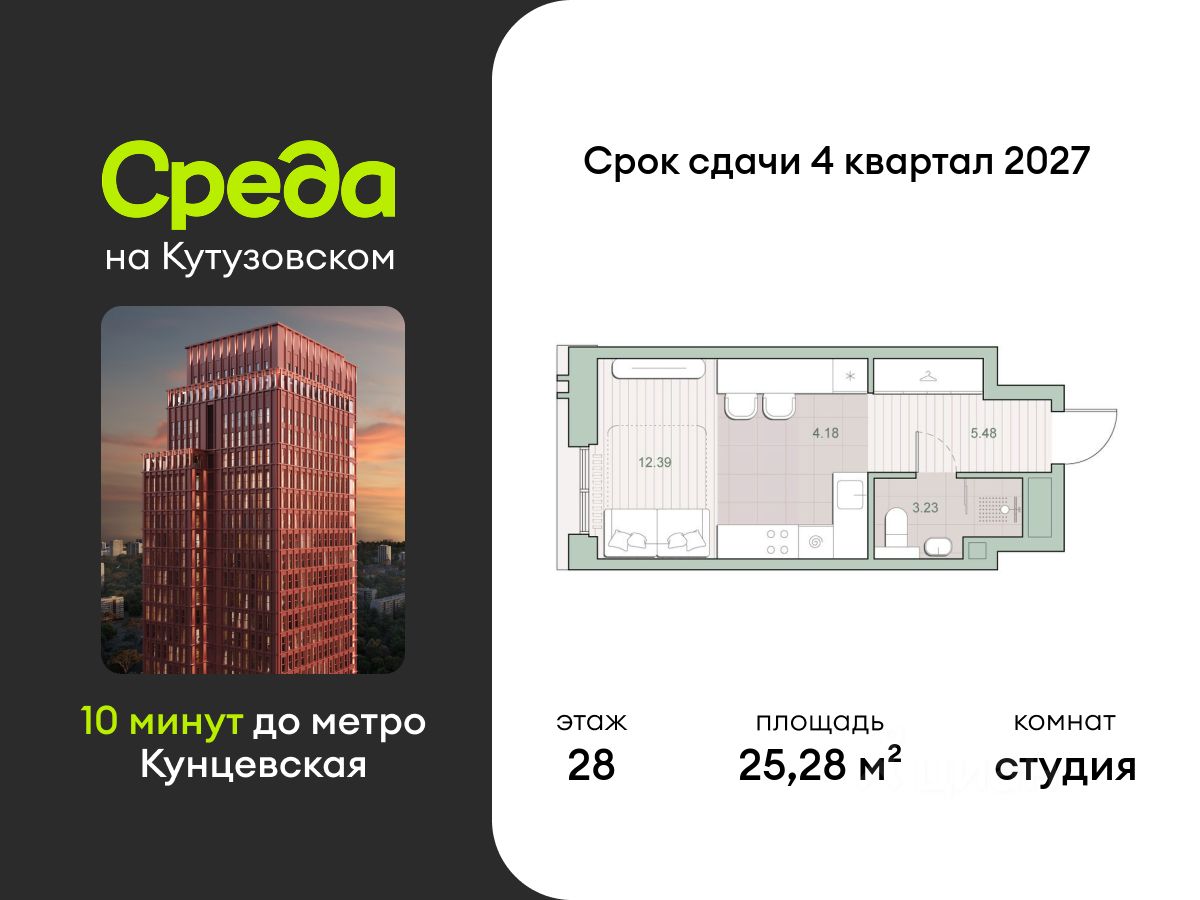 Продаётся студия общей площадью 25.28 кв. м. с отделкой на выбор: черновая, White Box. Квартира на 28 этаже корпуса 5 в жилом комплексе бизнес-класса "Среда на Кутузовском". До метро "Кунцевская" 10 минут пешком.