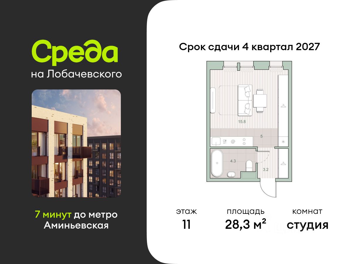 Продаётся студия общей площадью 28.30 кв. м. с отделкой на выбор: черновая, White Box. Квартира на 11 этаже корпуса 5.8 в жилом комплексе бизнес-класса "Среда на Лобачевского". До метро "Аминьевская" 7 минут пешком.