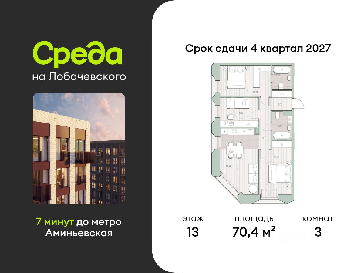 Продаётся трехкомнатная квартира общей площадью 70.40 кв. м. с отделкой на выбор: черновая, White Box. Квартира на 13 этаже корпуса 5.6 в жилом комплексе бизнес-класса "Среда на Лобачевского". До метро "Аминьевская" 7 минут пешком.