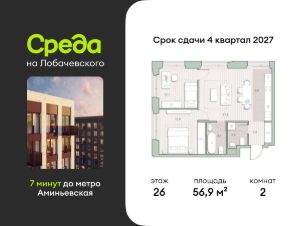 Продаётся двухкомнатная квартира общей площадью 56.90 кв. м. с отделкой на выбор: черновая, White Box. Квартира на 26 этаже корпуса 5.5 в жилом комплексе бизнес-класса "Среда на Лобачевского". До метро "Аминьевская" 7 минут пешком.