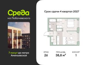Продаётся однокомнатная квартира общей площадью 38.80 кв. м. с отделкой на выбор: черновая, White Box. Квартира на 26 этаже корпуса 5.5 в жилом комплексе бизнес-класса "Среда на Лобачевского". До метро "Аминьевская" 7 минут пешком.