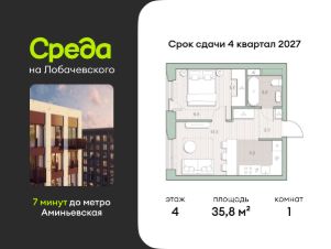 Продаётся однокомнатная квартира общей площадью 35.80 кв. м. с отделкой на выбор: черновая, White Box. Квартира на 4 этаже корпуса 5.5 в жилом комплексе бизнес-класса "Среда на Лобачевского". До метро "Аминьевская" 7 минут пешком.