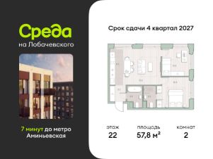Продаётся двухкомнатная квартира общей площадью 57.80 кв. м. с отделкой на выбор: черновая, White Box. Квартира на 22 этаже корпуса 5.5 в жилом комплексе бизнес-класса "Среда на Лобачевского". До метро "Аминьевская" 7 минут пешком.