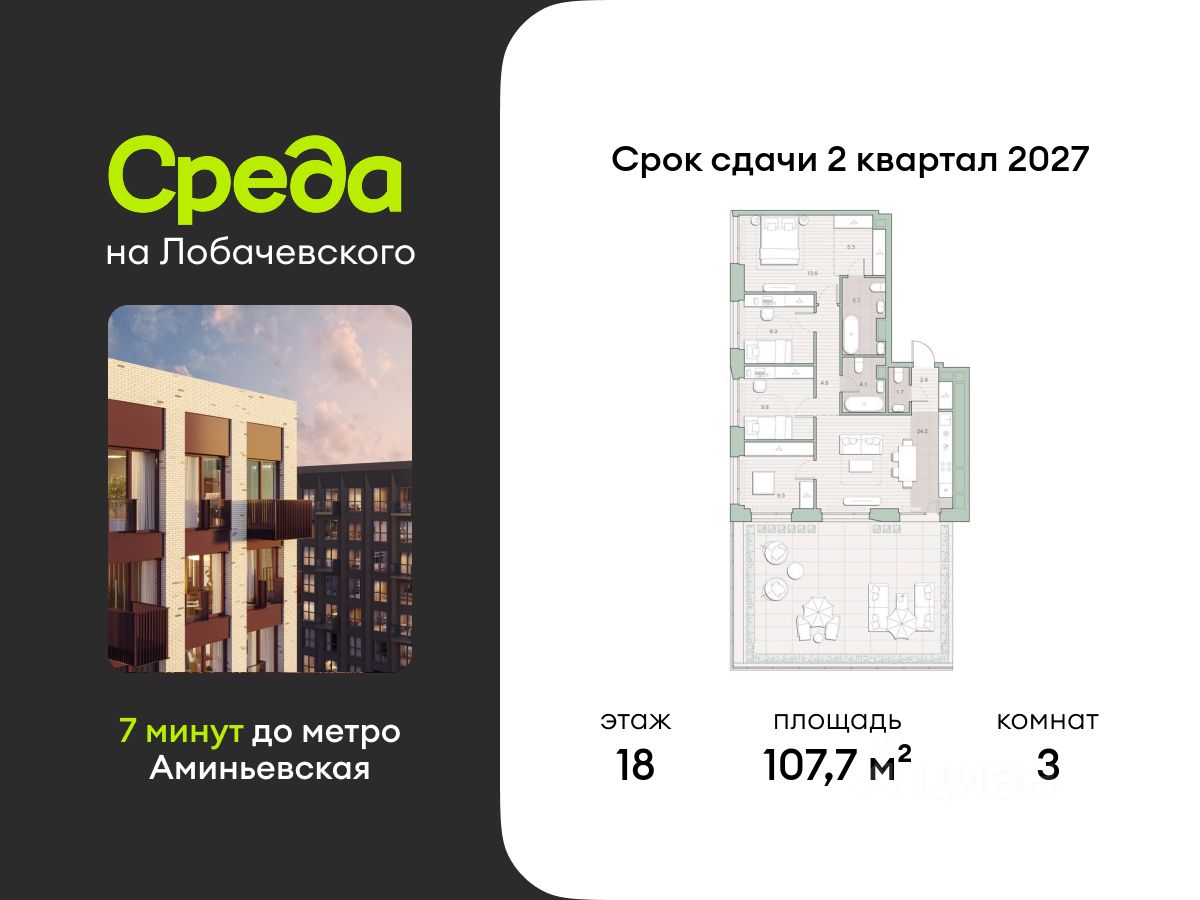 Продаётся трехкомнатная квартира общей площадью 107.70 кв. м. с отделкой на выбор: черновая, White Box. Квартира на 18 этаже корпуса 5.4 в жилом комплексе бизнес-класса "Среда на Лобачевского". До метро "Аминьевская" 7 минут пешком.