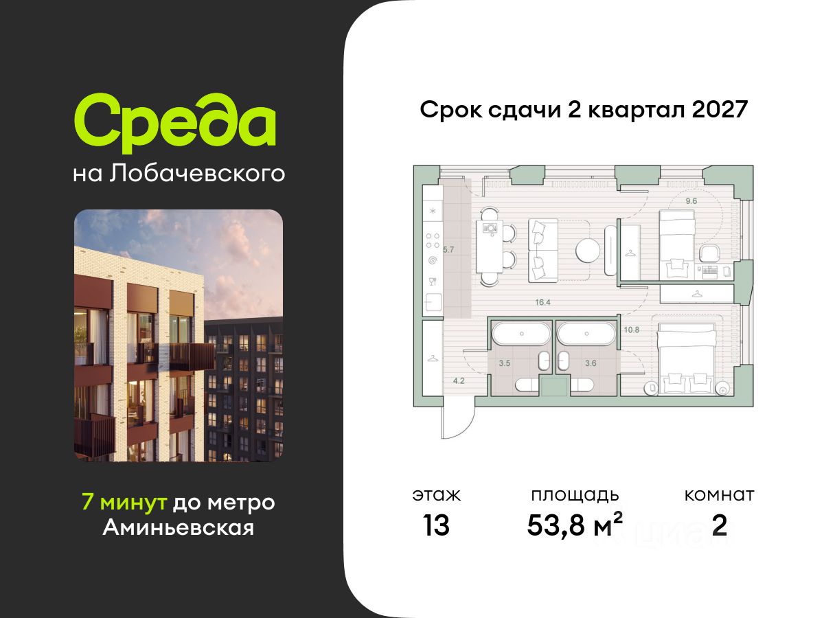 Продаётся двухкомнатная квартира общей площадью 53.80 кв. м. с отделкой на выбор: черновая, White Box. Квартира на 13 этаже корпуса 5.4 в жилом комплексе бизнес-класса "Среда на Лобачевского". До метро "Аминьевская" 7 минут пешком.