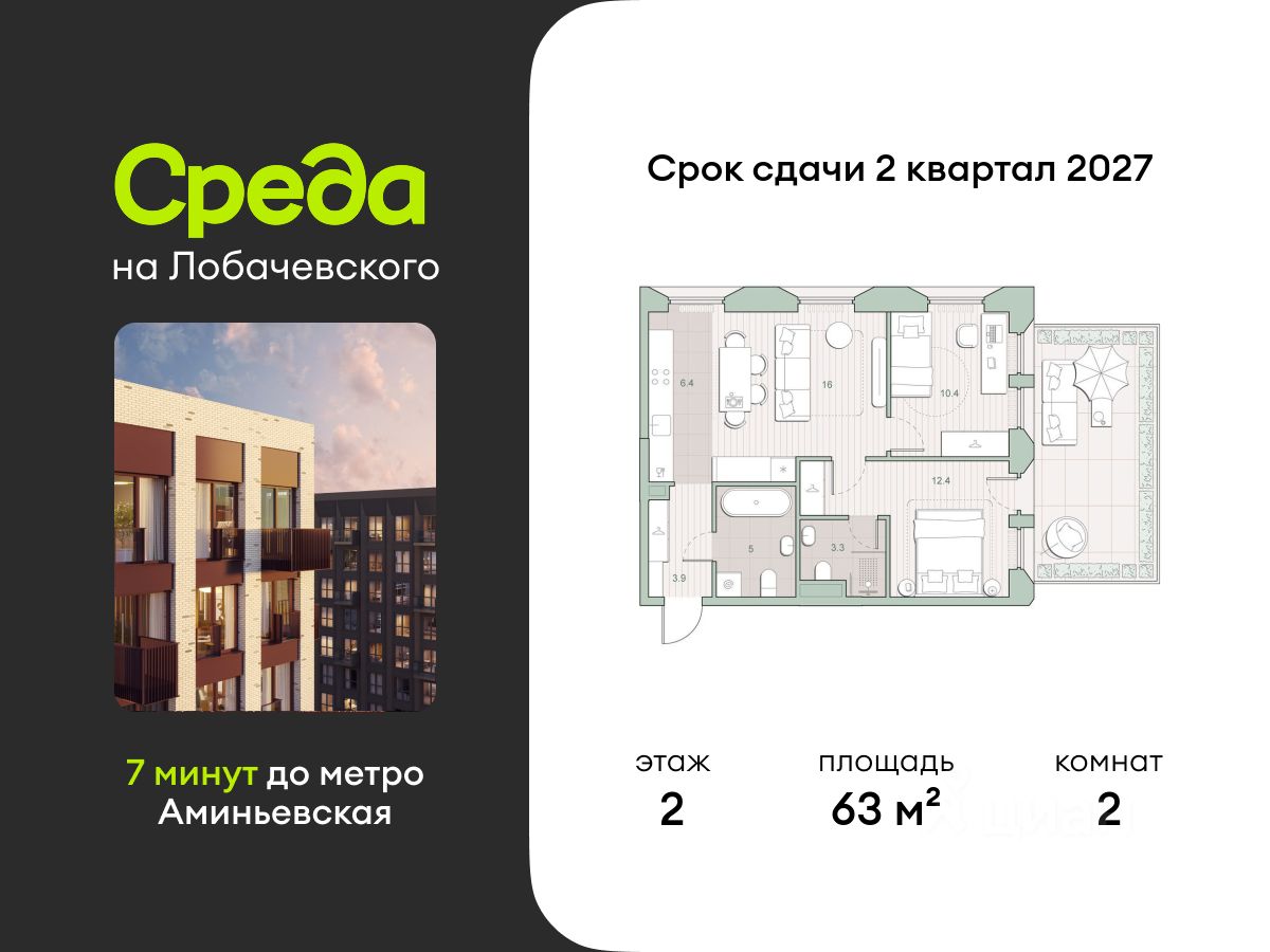 Продаётся двухкомнатная квартира общей площадью 63.00 кв. м. с отделкой на выбор: черновая, White Box. Квартира на 2 этаже корпуса 5.2 в жилом комплексе бизнес-класса "Среда на Лобачевского". До метро "Аминьевская" 7 минут пешком.