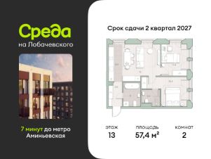 Продаётся двухкомнатная квартира общей площадью 57.40 кв. м. с отделкой на выбор: черновая, White Box. Квартира на 13 этаже корпуса 5.1 в жилом комплексе бизнес-класса "Среда на Лобачевского". До метро "Аминьевская" 7 минут пешком.