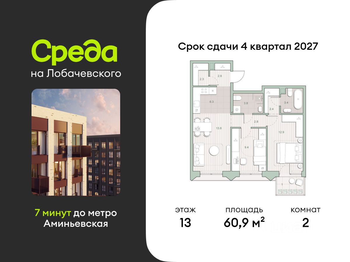 Продаётся двухкомнатная квартира общей площадью 60.90 кв. м. с отделкой на выбор: черновая, White Box. Квартира на 13 этаже корпуса 5.7 в жилом комплексе бизнес-класса "Среда на Лобачевского". До метро "Аминьевская" 7 минут пешком.
