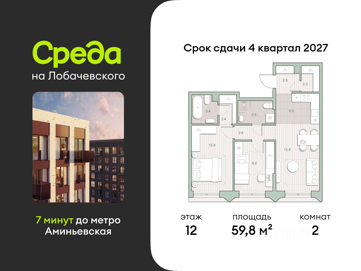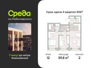 Продаётся двухкомнатная квартира общей площадью 59.80 кв. м. с отделкой на выбор: черновая, White Box. Квартира на 12 этаже корпуса 5.7 в жилом комплексе бизнес-класса "Среда на Лобачевского". До метро "Аминьевская" 7 минут пешком.