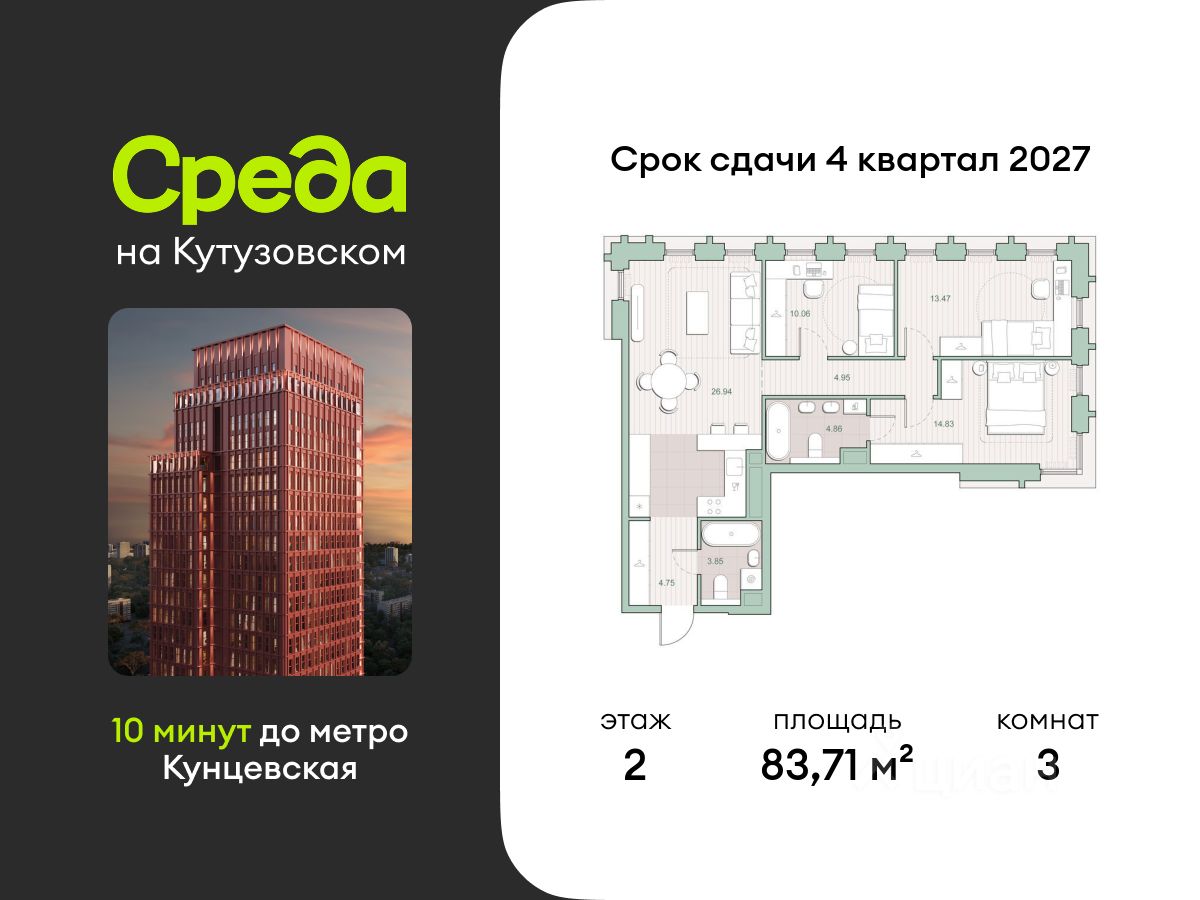 "Среда на Кутузовском" - новый квартал с башнями от 12 до 44 этажей, окружённый лесными массивами и историческими усадьбами старой Москвы. Во внутреннем дворе есть водоём, многоуровневые зоны с детскими и спортивными площадками, коворкинг на свежем воздухе и локации для уединённого отдыха.