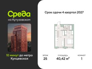 Продаётся однокомнатная квартира общей площадью 40.42 кв. м. с отделкой на выбор: черновая, White Box. Квартира на 25 этаже корпуса 5 в жилом комплексе бизнес-класса "Среда на Кутузовском". До метро "Кунцевская" 10 минут пешком.