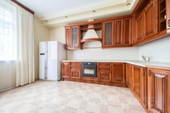Кухня оборудована всей необходимой техникой: встроенные посудомоечная машина на 45 см., микроволновая печь и духовой шкаф, варочная индукционная плита. Отдельно стоит двустворчатый большой холодильник и морозильная камера.