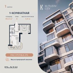 Продаётся светлая однокомнатная квартира площадью 45 м² в башне "Гармония" клубного дома "Кутузов Сити".