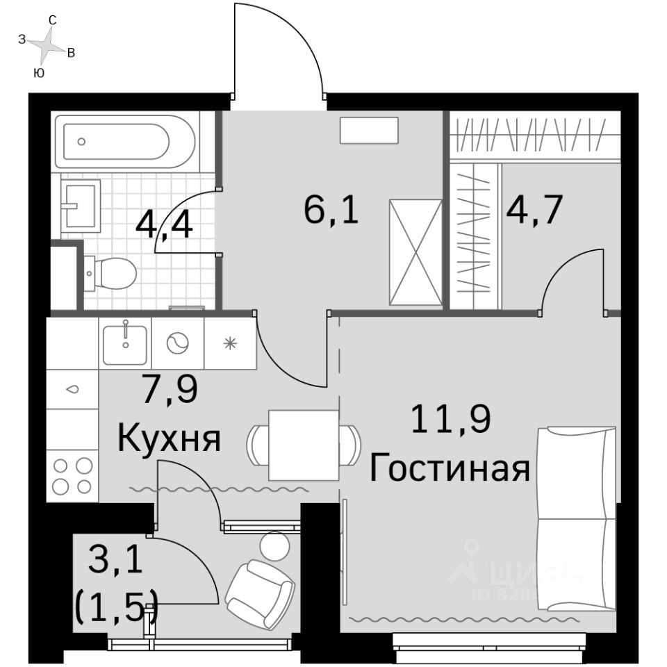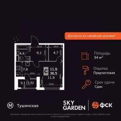 Продаётся квартира-студия номер 1272 общей площадью 34.4 кв.м. на 15-м этаже 30 этажного здания. Предчистовая отделка. Цена с учётом скидки.
