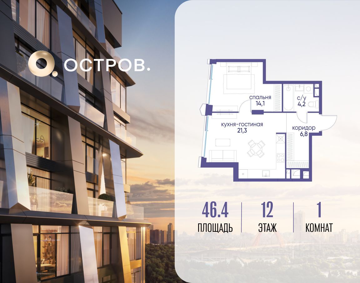 Продаётся однокомнатная квартира от застройщика: общая площадь 46.40 м², жилая 14.10 м², кухня 21.30 м², 12, жилой квартал "Остров 12", корпус 3 (12.1 квартал) (секция 1). срок сдачи: 4-кв. 2025.
