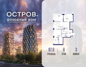 Продаётся 3-комн. квартира от застройщика: общая площадь 87.60 м², жилая 44.00 м², кухня 22.20 м², 8-й этаж, жилой квартал "Остров 14", корпус 6 (секция 1). Срок сдачи: 2 квартал 2029 года.