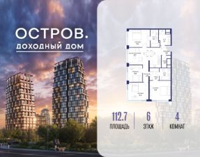 Продаётся 4-комн. квартира от застройщика: общая площадь 112.70 м², жилая 55.90 м², кухня 23.70 м², 6-й этаж, жилой квартал "Остров 14", корпус 6 (секция 1). Срок сдачи: 2 квартал 2029 года.