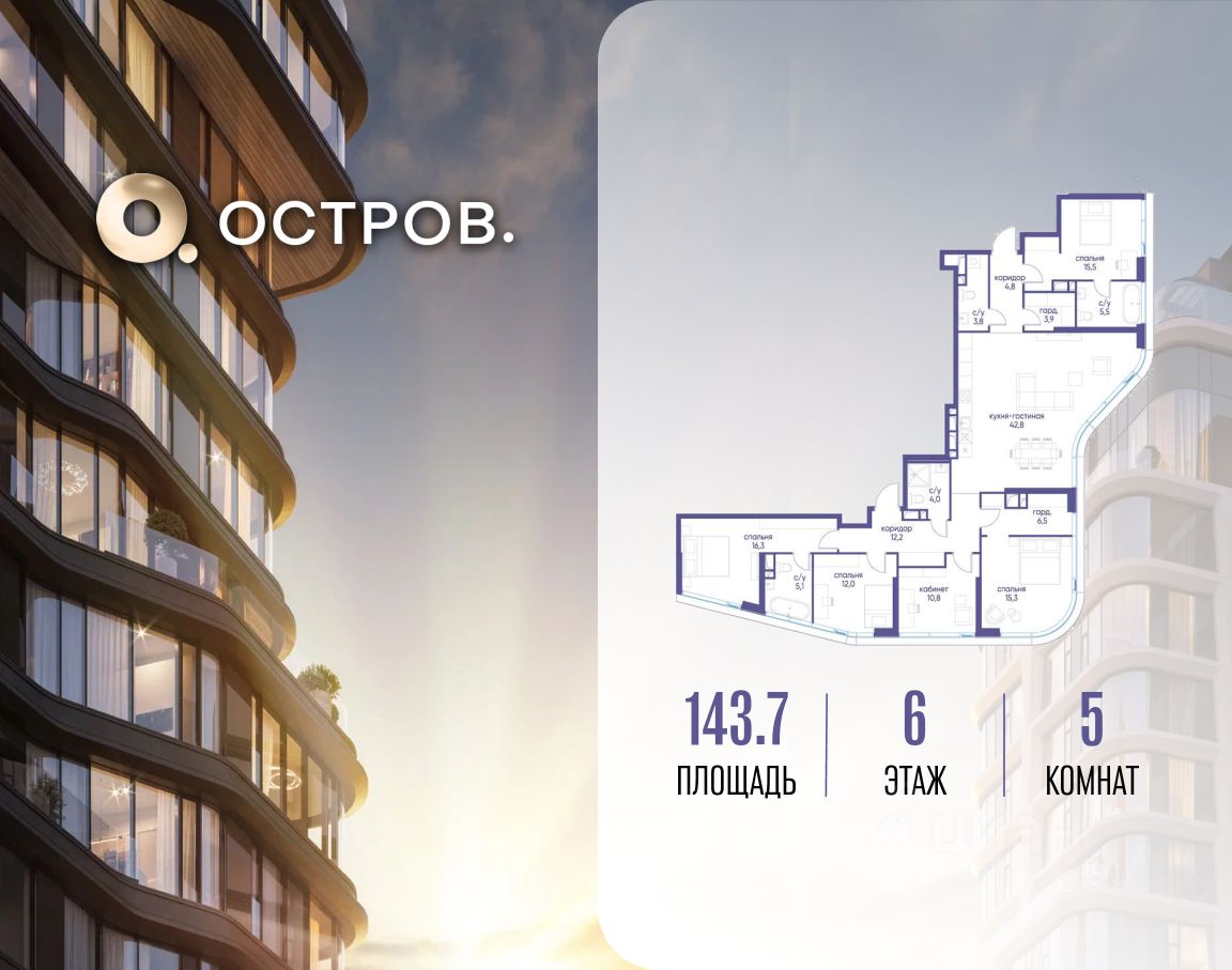 Продаётся квартира от застройщика: общая площадь 143.70 м², жилая 69.90 м², кухня 42.80 м², 6-й этаж, жилой квартал "Остров 12", корпус 2 (секция 1). Срок сдачи: 1 квартал 2029 года.