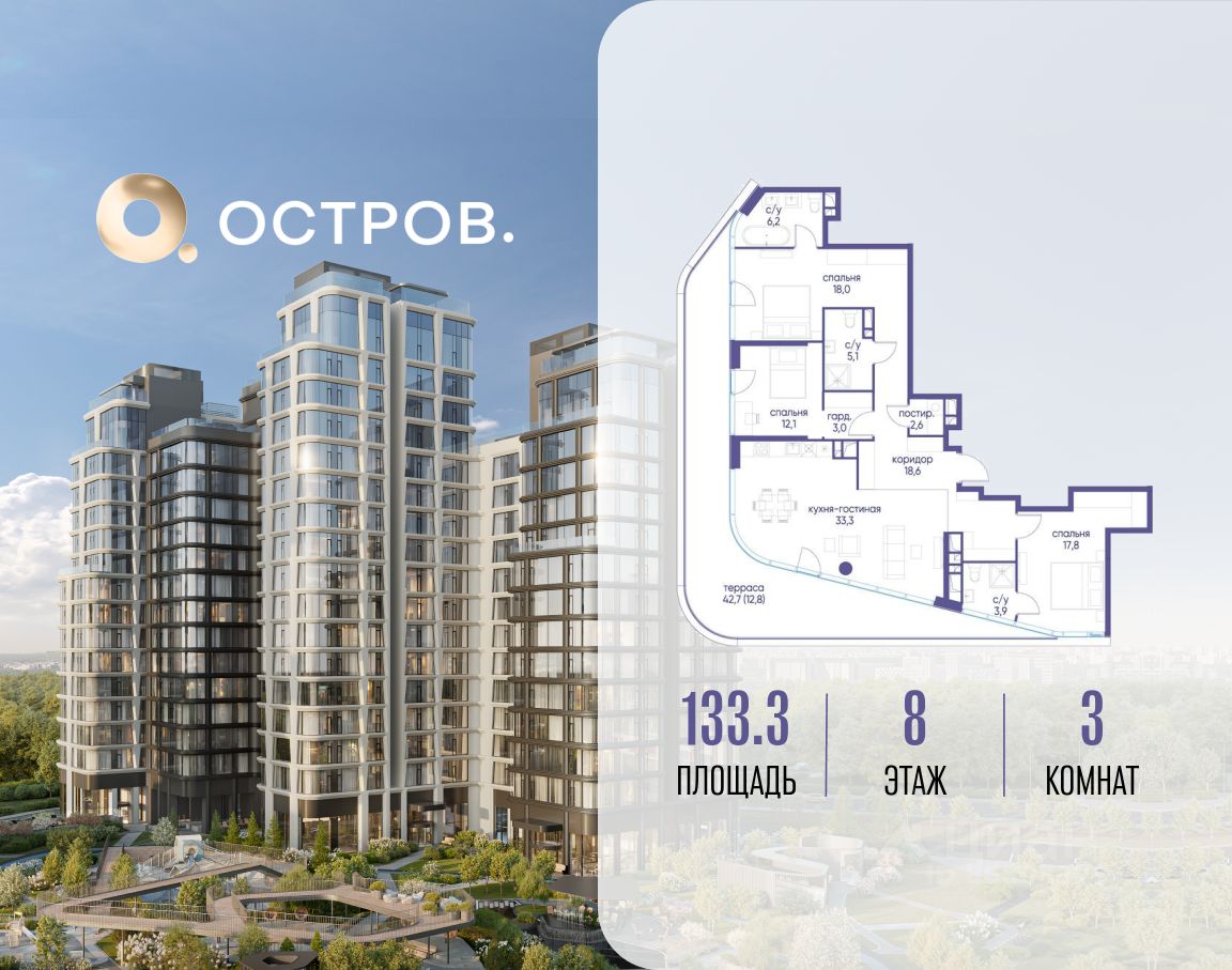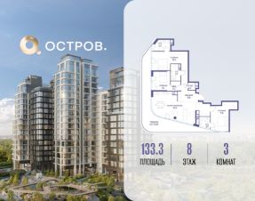 Продаётся 3-комн. квартира от застройщика: общая площадь 133.30 м², жилая 47.90 м², кухня 33.30 м², 8-й этаж, жилой квартал "Остров 12", корпус 6 (секция 1). Срок сдачи: 1 квартал 2029 года.