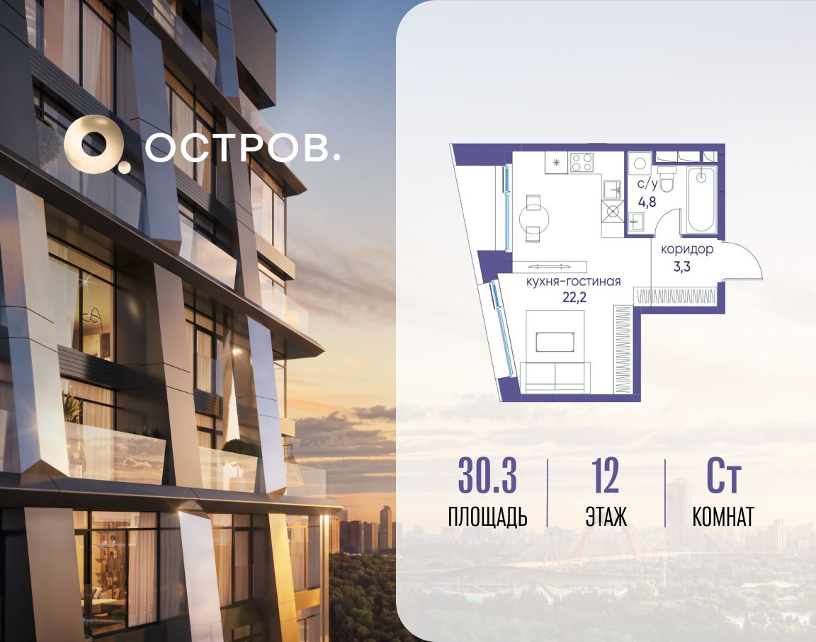 Продаётся студия от застройщика: общая площадь 30.30 м², жилая 17.20 м², кухня 5.00 м², 12, жилой квартал "Остров 12", корпус 1 (12.1 квартал) (секция 2). срок сдачи: 4-кв. 2025.