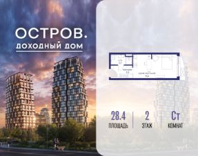 Продаётся квартира от застройщика: общая площадь 28.40 м², жилая 14.40 м², кухня 5.00 м², 2-й этаж, жилой квартал "Остров 14", корпус 1 (секция 2). Срок сдачи: 2 квартал 2029 года.