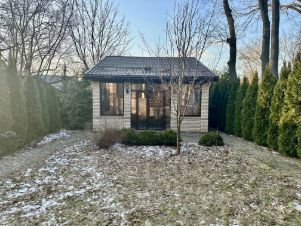 На участке дополнительное строение — Домик летней кухни из кирпича с большими окнами.