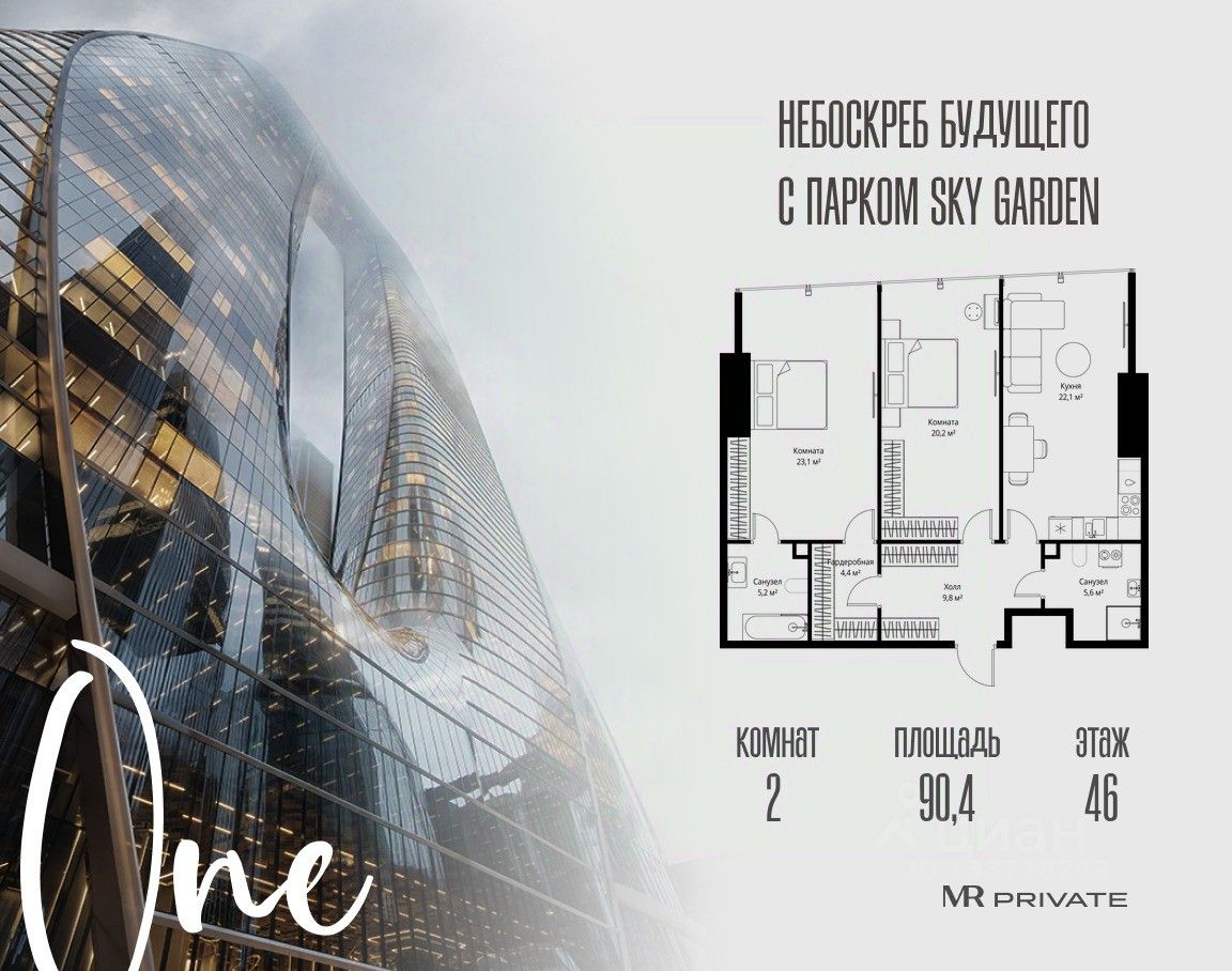 В продаже 2-комнатная квартира площадью 90.40 м² на 46-м этаже.