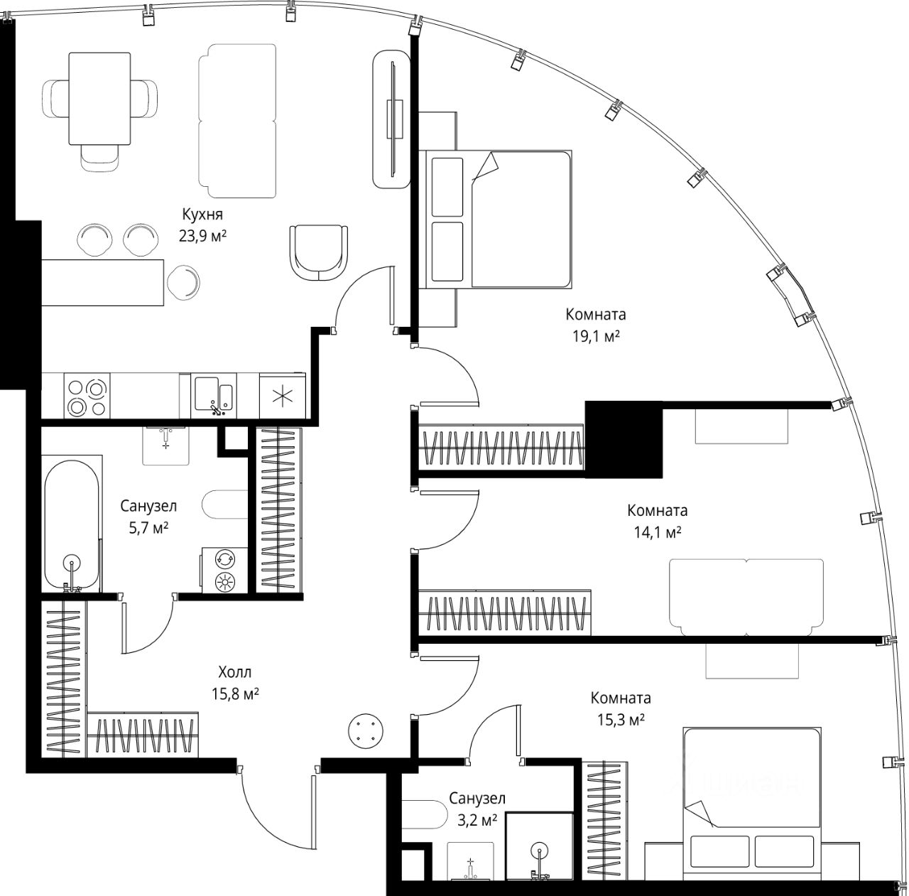 - Панорамное остекление от пола до потолка во всех квартирах