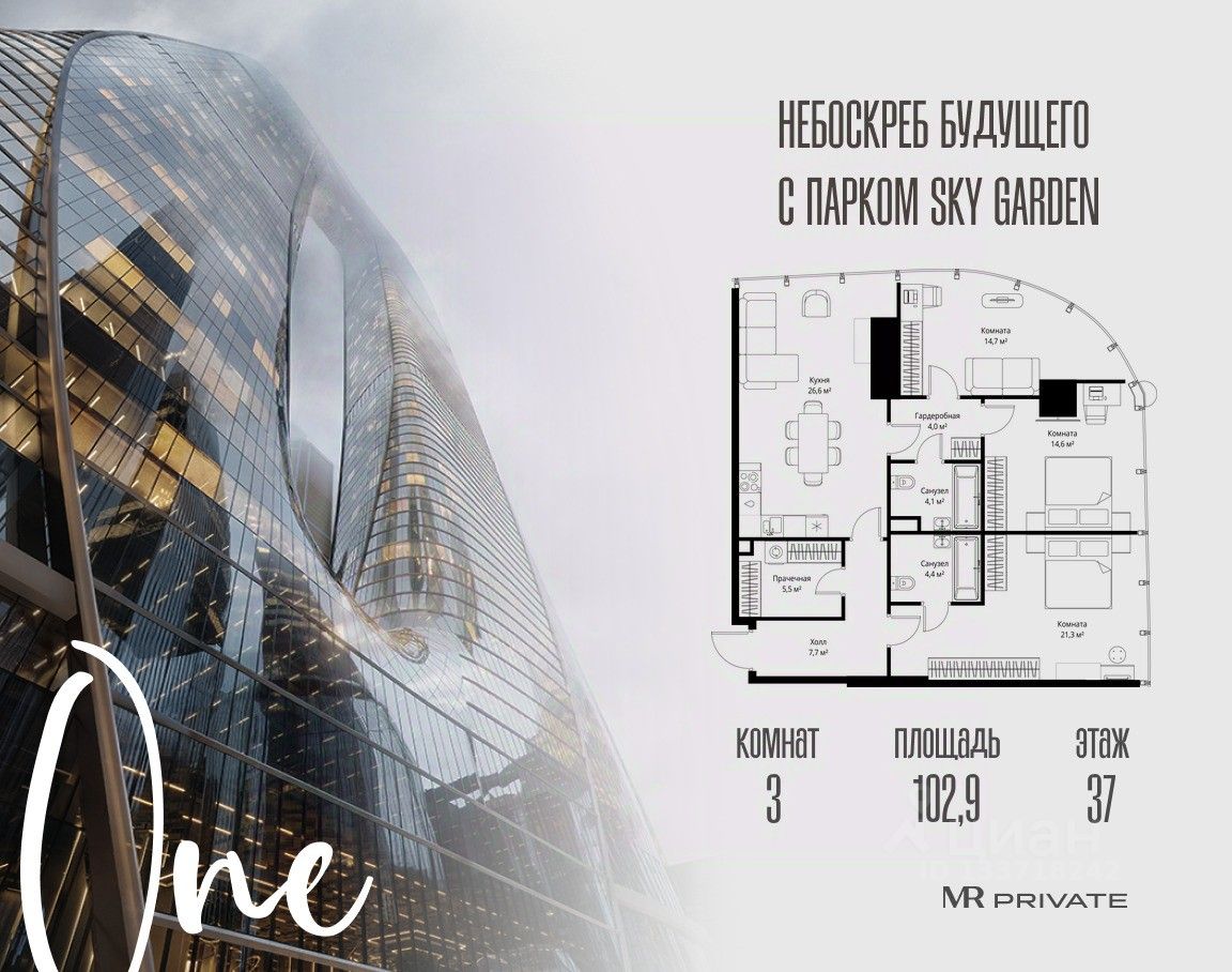 В продаже 3-комнатная квартира площадью 102.90 м² на 37-м этаже.