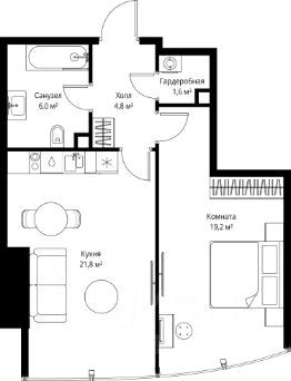 В продаже 1-комнатная квартира площадью 53.40 м² на 45-м этаже.
