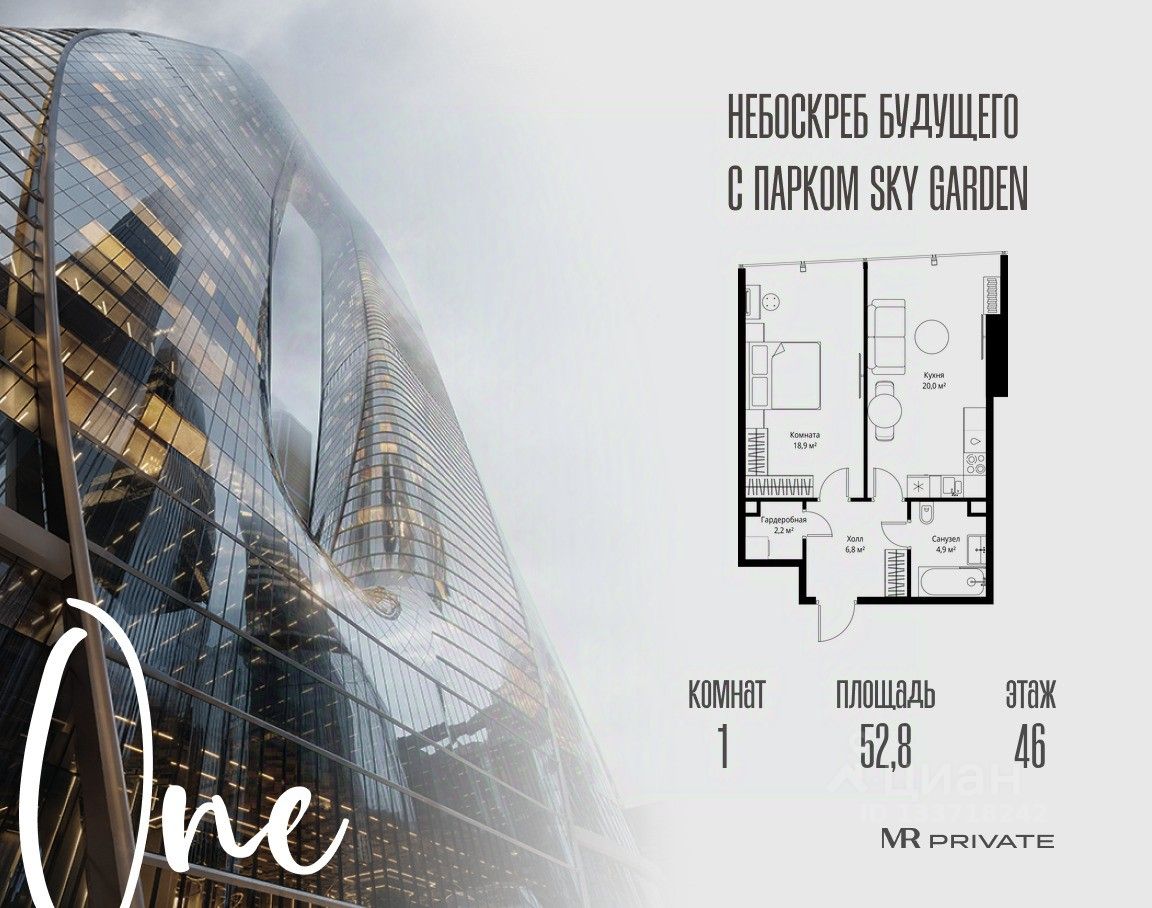 В продаже 1-комнатная квартира площадью 52.80 м² на 46-м этаже.