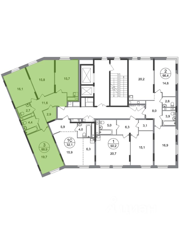 Общая площадь квартиры - 88,9 кв. м, этаж 16 из 17.