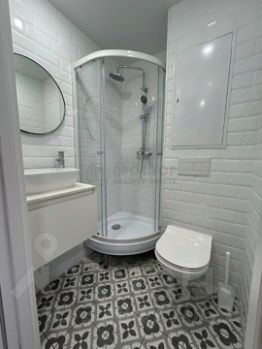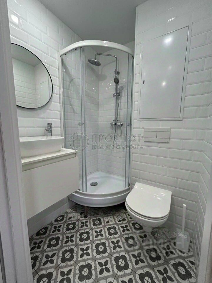 Санузел: совмещенный, современная душевая кабина, унитаз, раковина с тумбой.