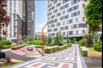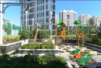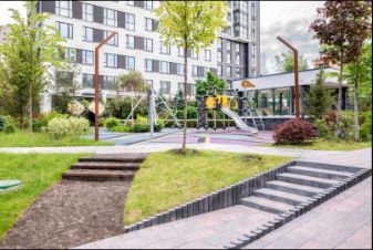 Дом с собственной территорией, детской площадкой, спортивными площадками и подземной парковкой.