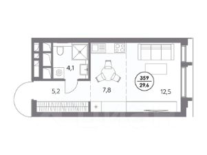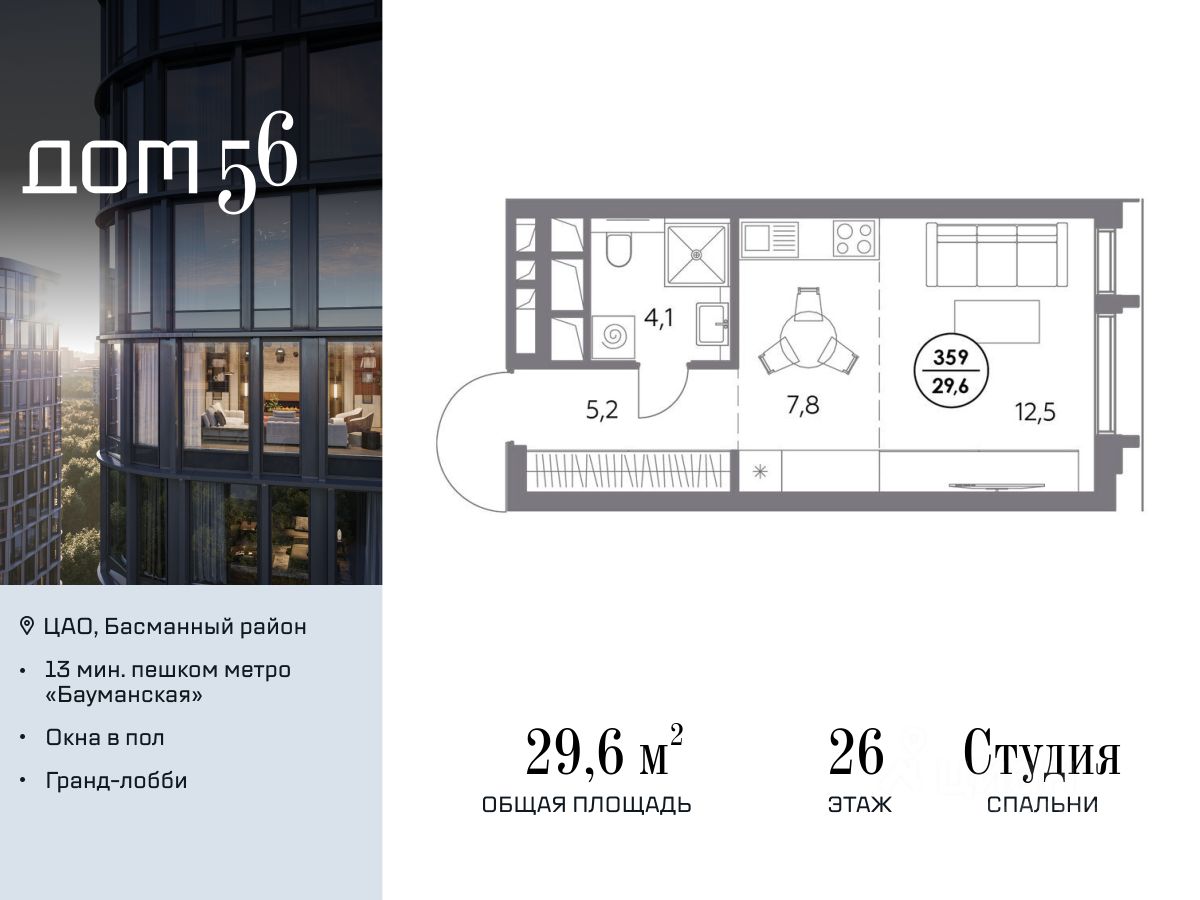 В премиум-квартале "Дом 56" на Бауманской напрямую от девелопера ГК "Галс-Девелопмент" представлена студия на 26 этаже общей площадью 29.60 м².