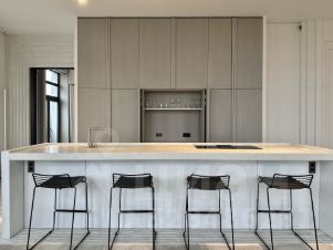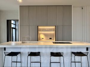 Кухня оснащена премиальной техникой ASKO, BORK, LIEBHERR, ELICA TESLA - духовой шкаф с паром, посудомоечная машина, холодильник, морозильник, варочная панель, винный холодильник.